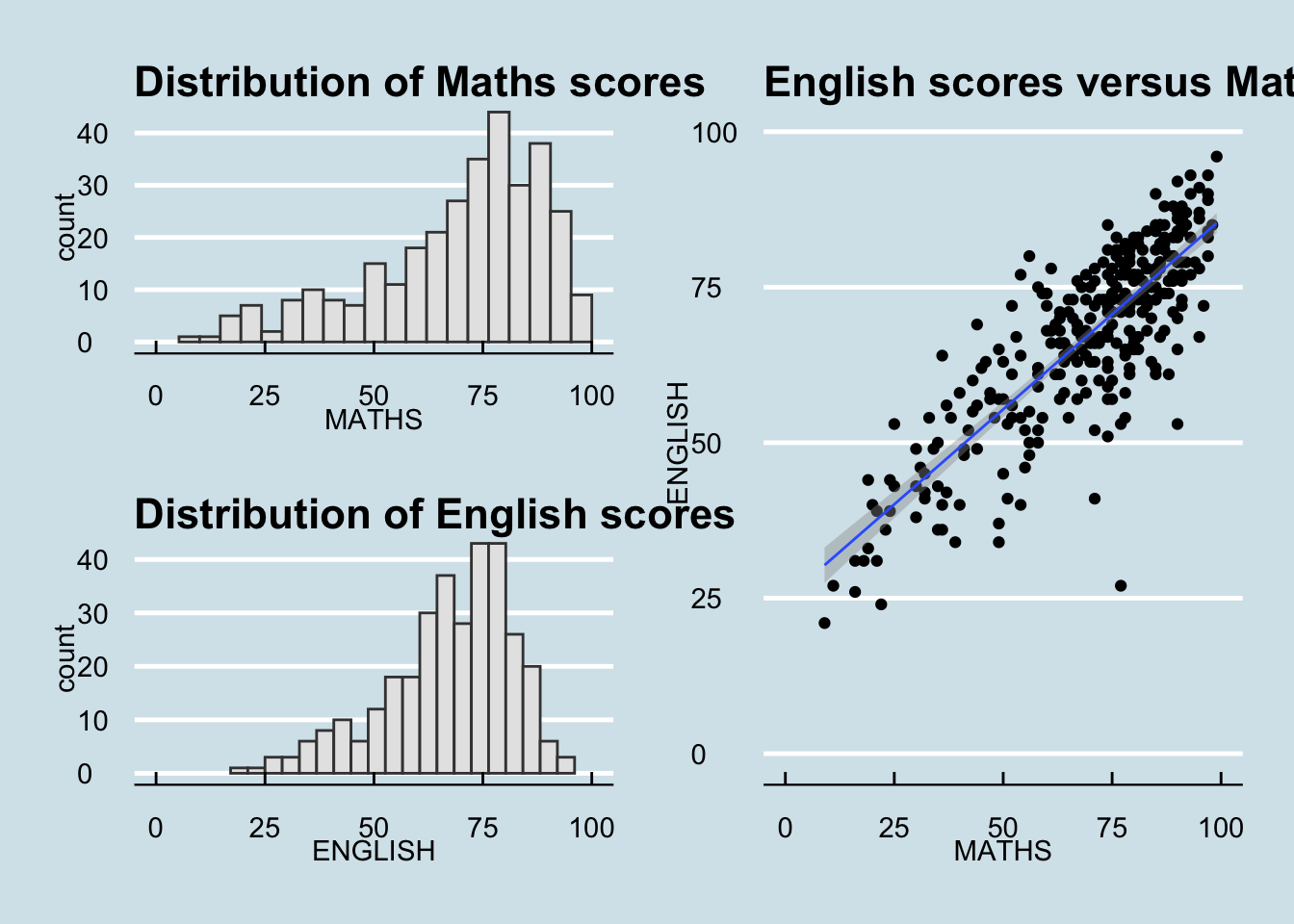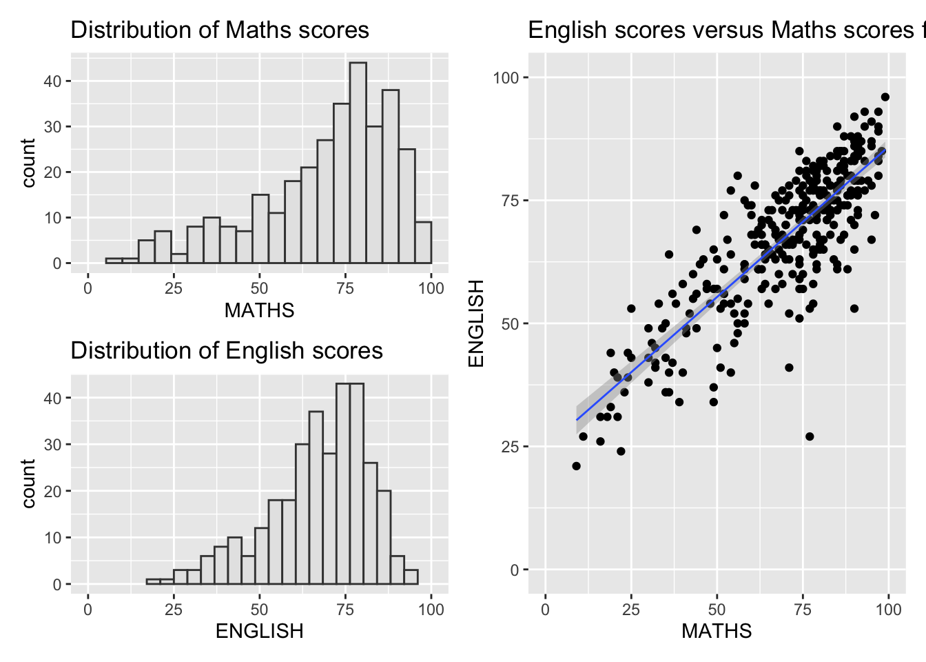 ggtitle("English scores versus Maths scores for Primary 3")Combine Two Plots Horizontally