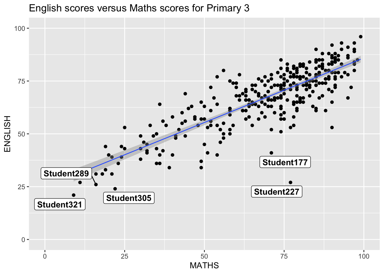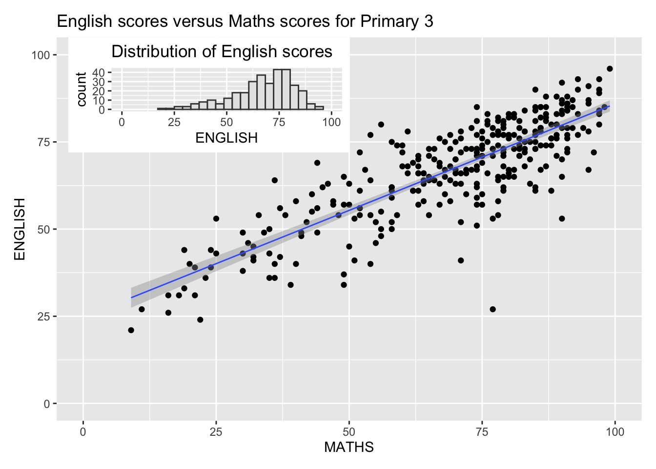ggtitle("English scores versus Maths scores for Primary 3")Warning: Using `size` aesthetic for lines was deprecated in ggplot2 3.4.0.